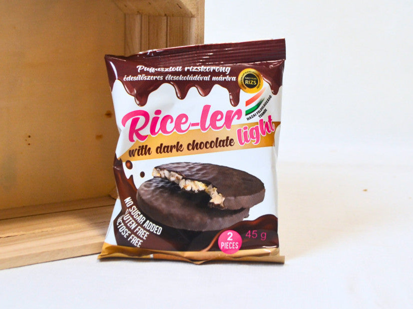 A mártott rizskorongok, minőségi belga étcsokoládéval vannak teljesen bemártva.